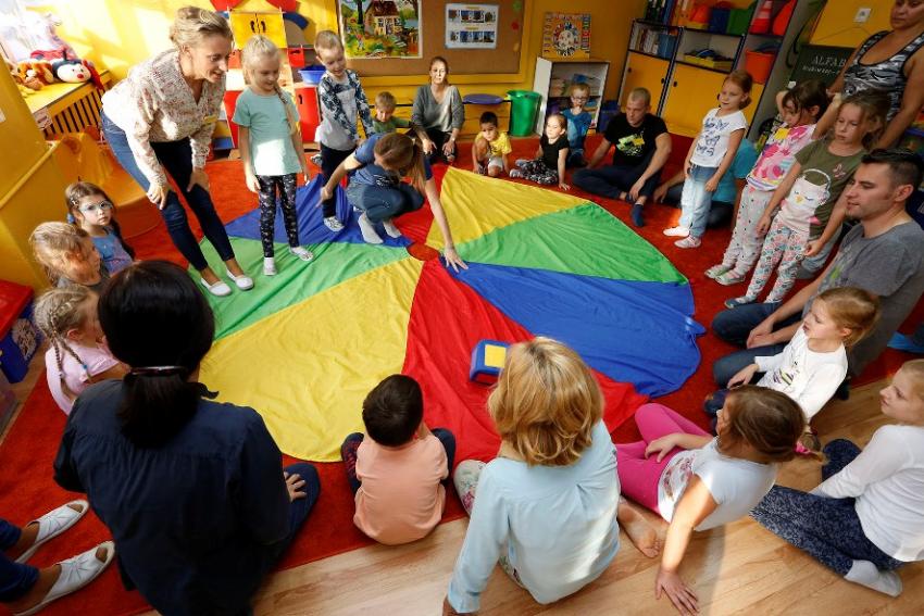 "KOLOROWY ZAWRÓT GŁOWY, CZYLI ZABAWY Z CHUSTĄ ANIMACYJNĄ" W GRUPIE IV